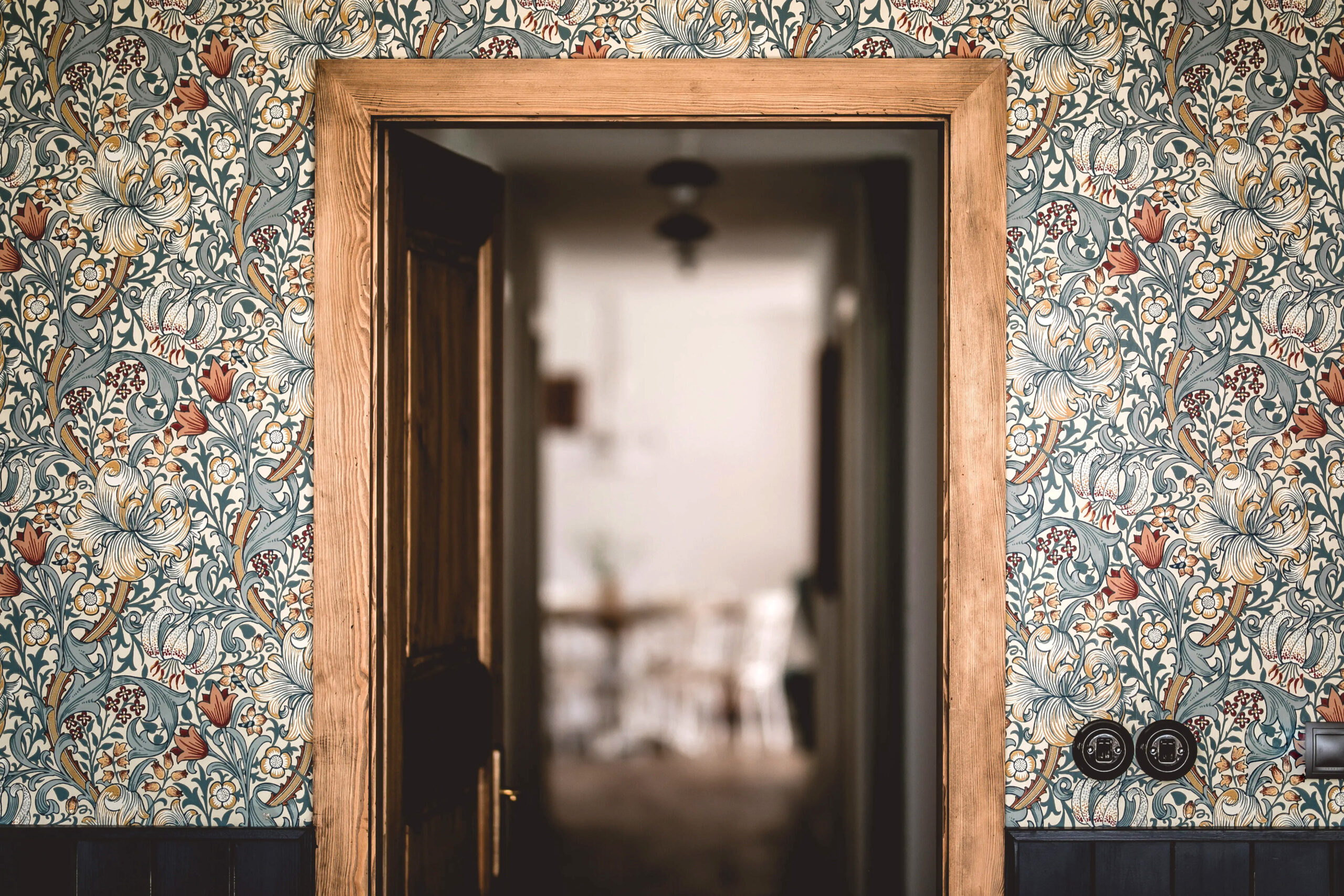 A new house that respects the character of the surrounding buildings in Czech Canada. The space transitions from the traditional ground floor to more modern, minimalist apartments upstairs. The floor tiles with a wood pattern are adapted to the needs of the occupants: the owner with two dogs. Stairs made of aged sheet metal are a reminder of trips to Sicily and lead visitors to the guest rooms. The space for communal gatherings accentuates both worlds: the traditional (wood paneling, ornamental wallpaper) and contemporary (linen sofas, Il Fanale patinated metal lamps). Very traditional morphology, materials and textures reflecting the countryside.
